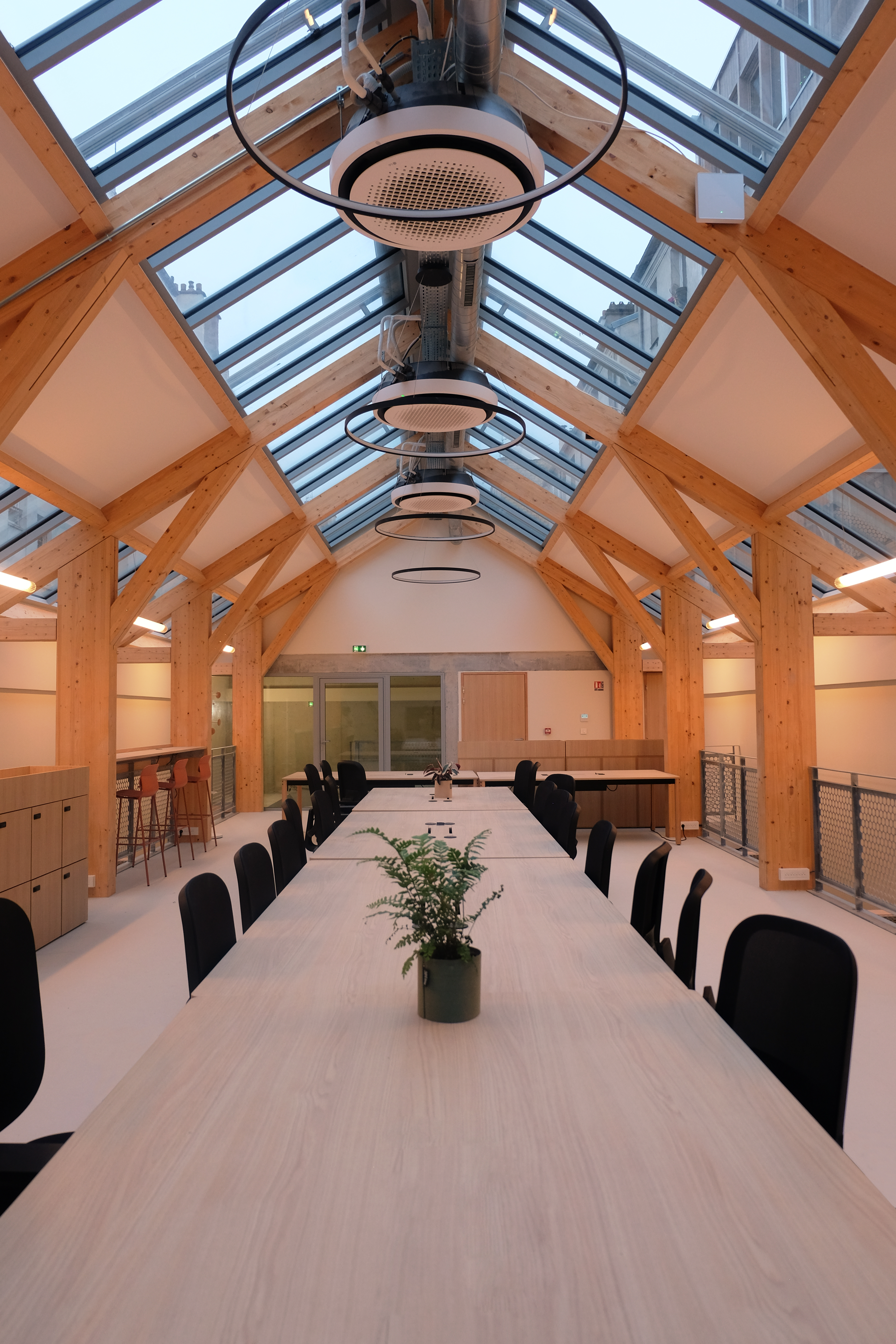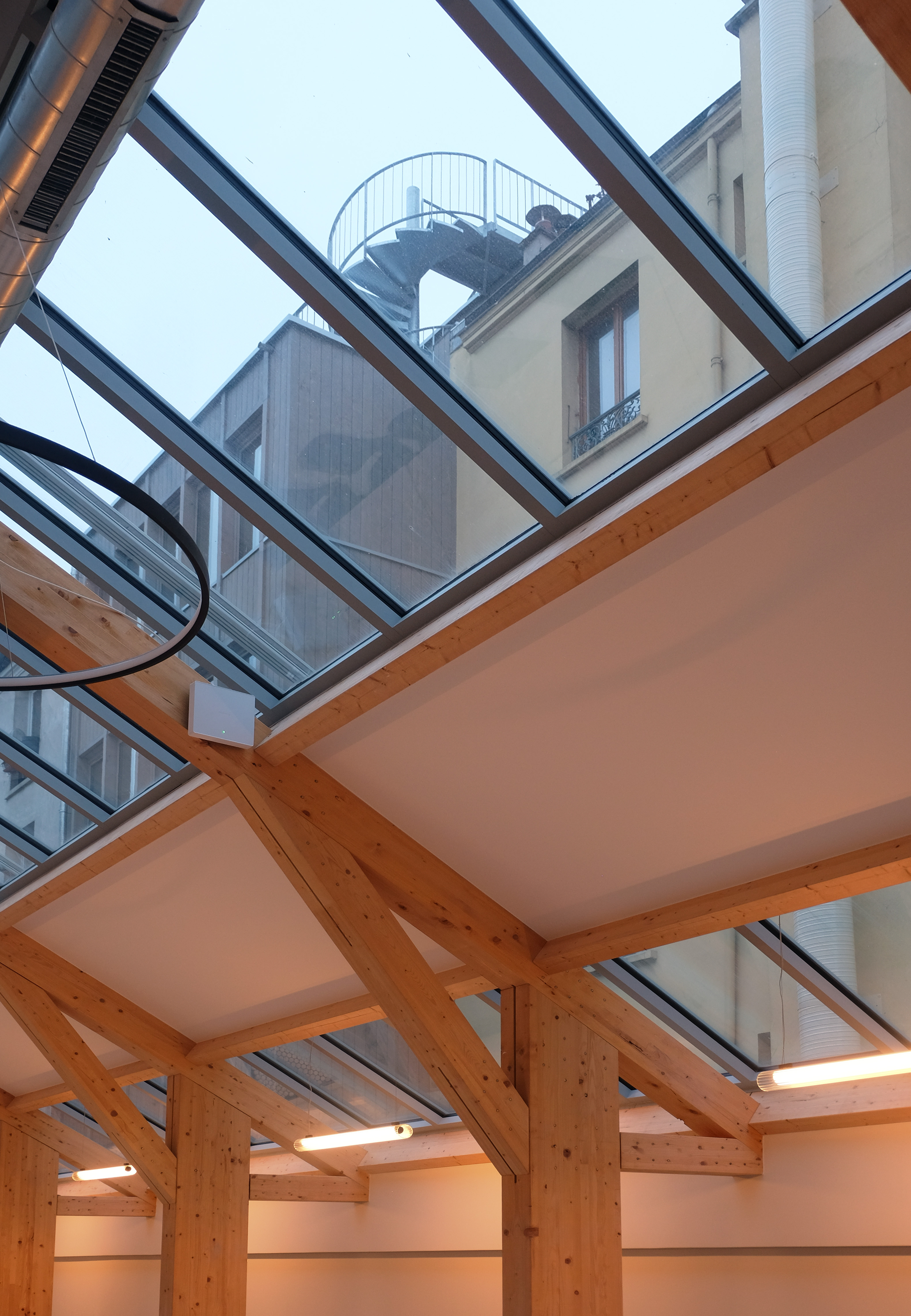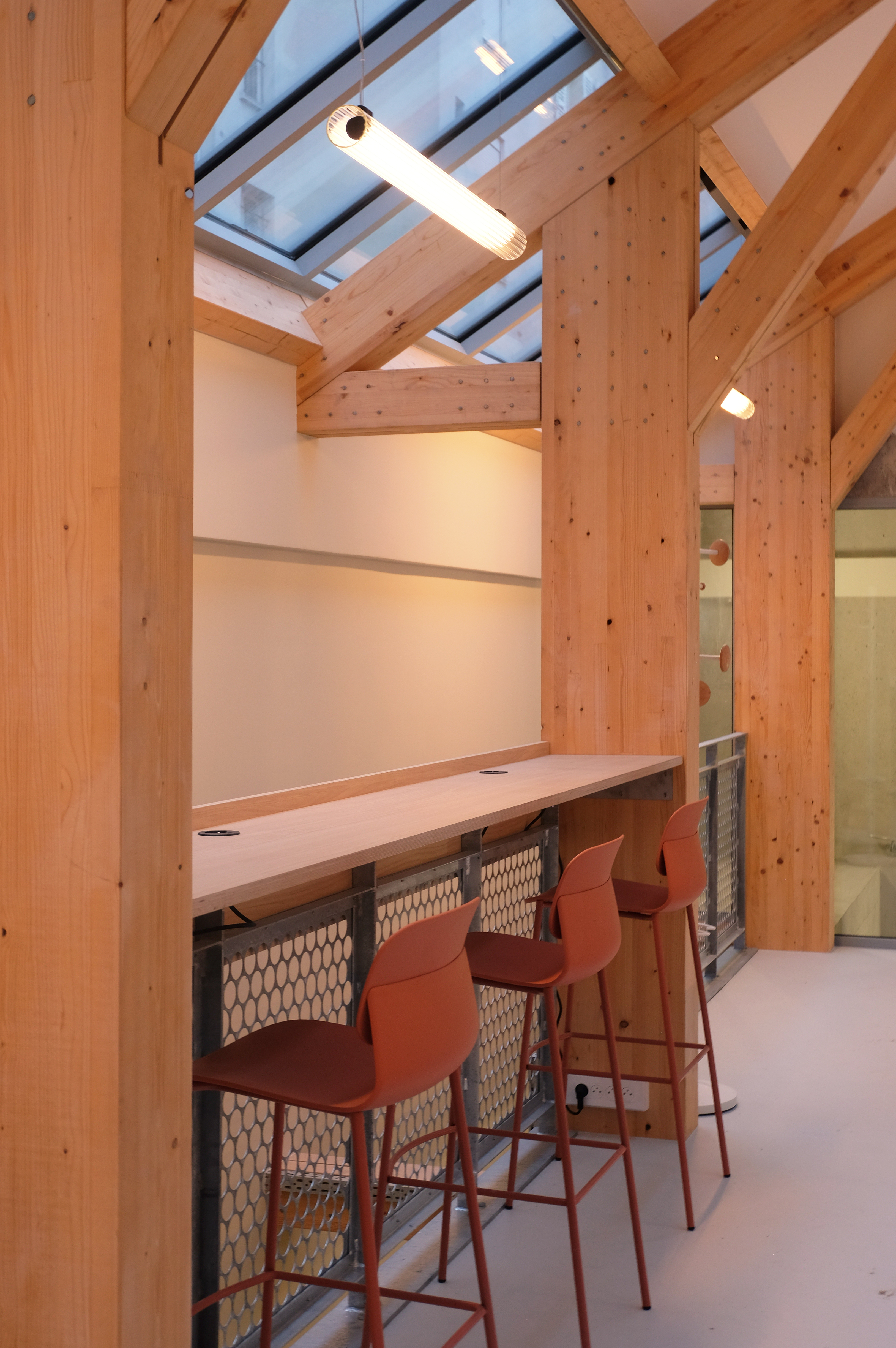 Implanté sur une parcelle en « L » contrainte par sa faible largeur sur rue et ses faibles possibilités d’éclairement sur cour, ce projet d’immeuble de bureaux et de coworking situé à proximité de la mairie de Montrouge propose une typologie double : un petit immeuble traversant en R+5 côté rue, et une halle composée de trois niveaux superposés côté cour. Dans la halle, une large verrière associée à des trémies d’éclairement latérales permettent d’amener de la lumière jusqu’au sous-sol aménagé. Afin d’accueillir une pluralité d’occupations au fil du temps (réunions en petits comités, coworking, événementiel) le plan s’attache à préserver une certaine flexibilité. Le projet décline par ailleurs plusieurs utilisations du bois et du béton : structure béton et menuiseries bois sur rue, soubassement béton et charpente bois moisée dans la halle.